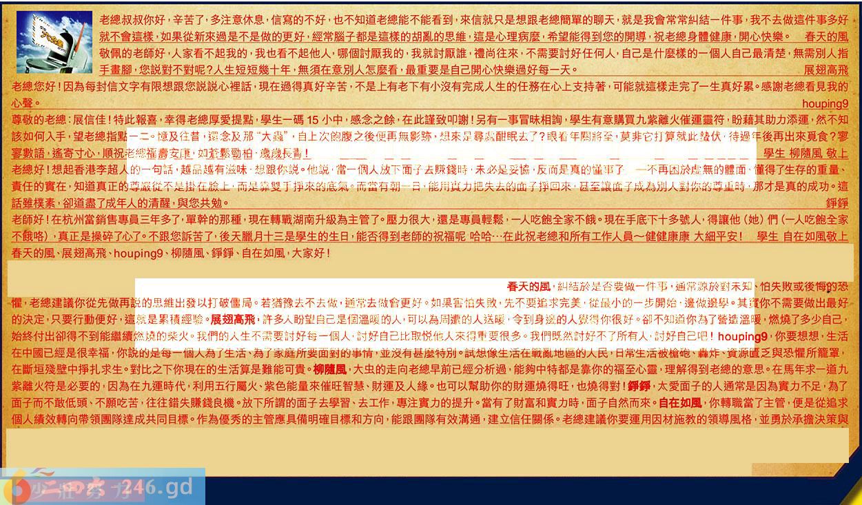 【3】.老總您好!因為每封信文字有限想跟您説説心裡話,現在過得真好辛苦,不是上有老下有小沒有完成人生的任務在心上支持著,可能就這樣走完了一生真好累。感謝老總看見我的心聲。9