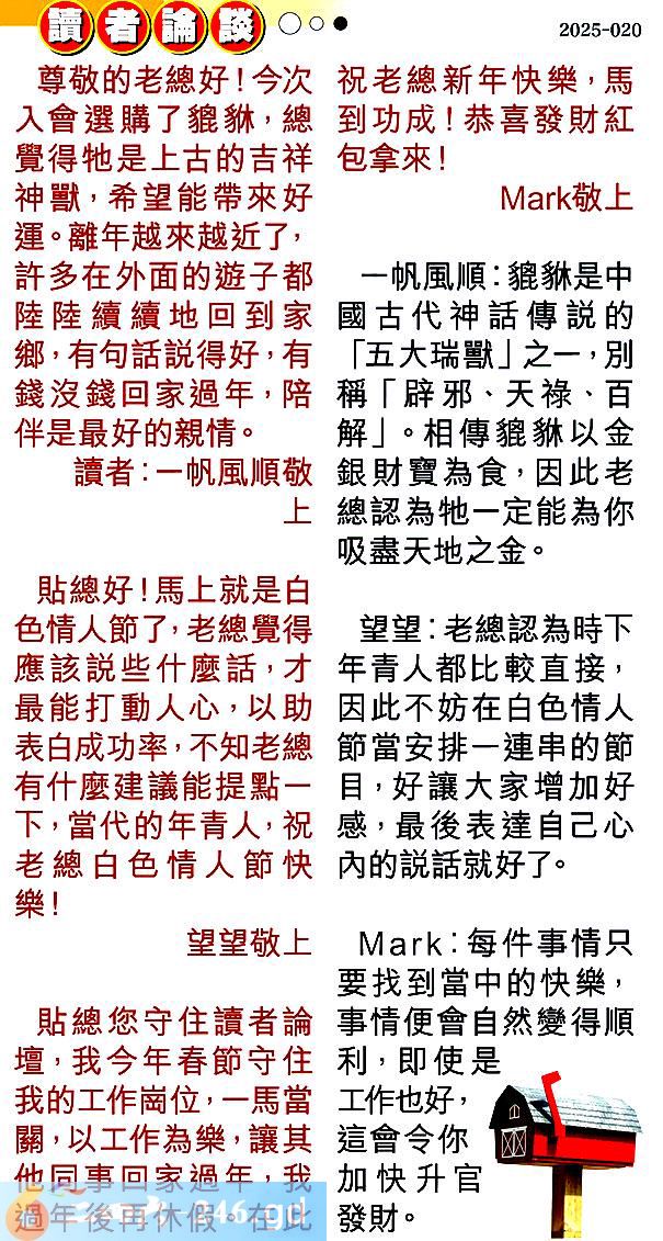 3.貼總您守住讀者論壇,我今年春節守住我的工作崗位,一馬當關,以工作為樂,讓其他同事回家過年,我過年後再休假。在此祝老總新年快樂,馬到功成!恭喜發財紅包拿來!敬上