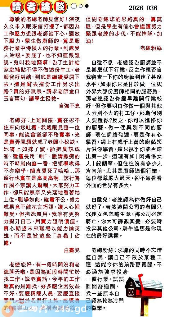 〖自強不息〗:老總認為廚師並不是甚麼低下行業,反之你應否自我審查一下你的廚藝到達了甚麼水平,如果你只是甘於做一位與外界大部份廚師相同的服務員,那老總認為你盡早離開行業較好,但你要明白你做一個與其他人分別不大的打工仔,那為何別人要選你?反之,你可以進修你的廚藝,做一個與別不同的廚師,現在網絡發達,要是你有心學習,網上有成千上萬的廚藝短片供你習,這只視乎你能否踏出第一步,道理有如「阿媽係女人」般簡單,但往往沒有多少人肯向前,尤其是廚師這個行業,每位都尊嚴大過天,卻不肯看看外面的世界有多大。
