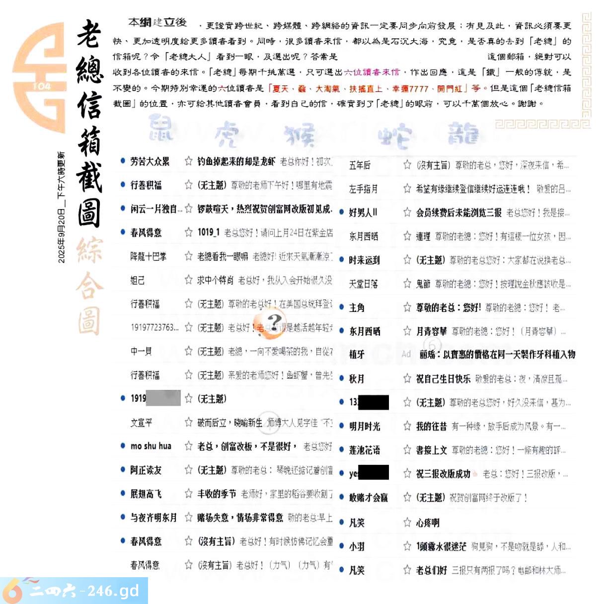 六合彩104期:六合皇金句/老总论码/萧公子/林大师/五行夺码/老总信箱截图