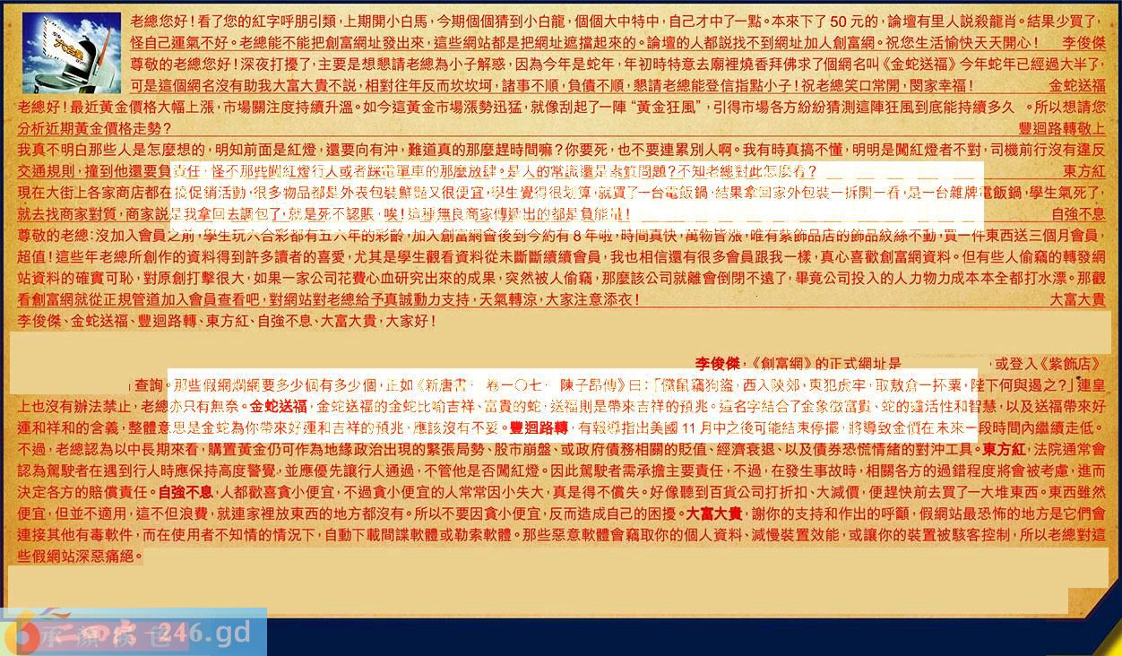 【1】.老總您好!看了您的紅字呼朋引,上期開小白馬,今期個個猜到小白龍,個個大中特中,自己才中了一點。本來下了50元的,論壇有里人說殺龍肖。結果少買了,怪自己運氣不好。老總能不能把創富網址發出來,這些網站都是把網址遮擋起來的。論壇的人都說找不到網址加人創富網。祝您生活愉快天天開心!李俊傑