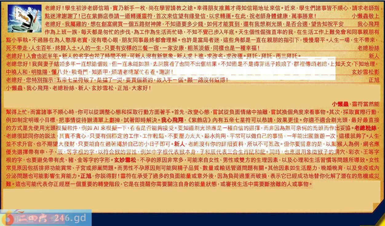【4】.老總好!入會也近半年。新人的名字也花了時間不短,可新人沒有新氣象,新人求上進,求改名,求改運。拜託,拜託,再三拜話。新人