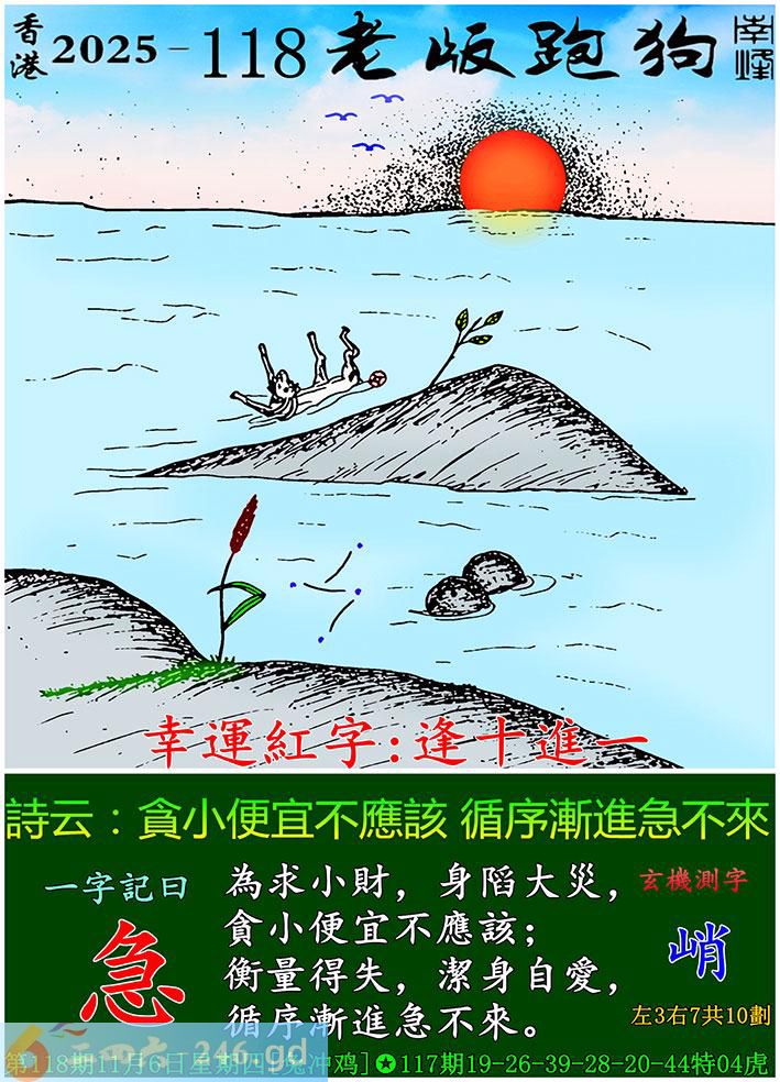118期老版跑狗一字記之曰:【急】 詩雲:貪小便宜不應該,循序漸進急不來。 為求小財,身䧟大災,貪小便宜不應該; 衡量得失,潔身自愛,循序漸進急不來。 玄機測字:《峭》