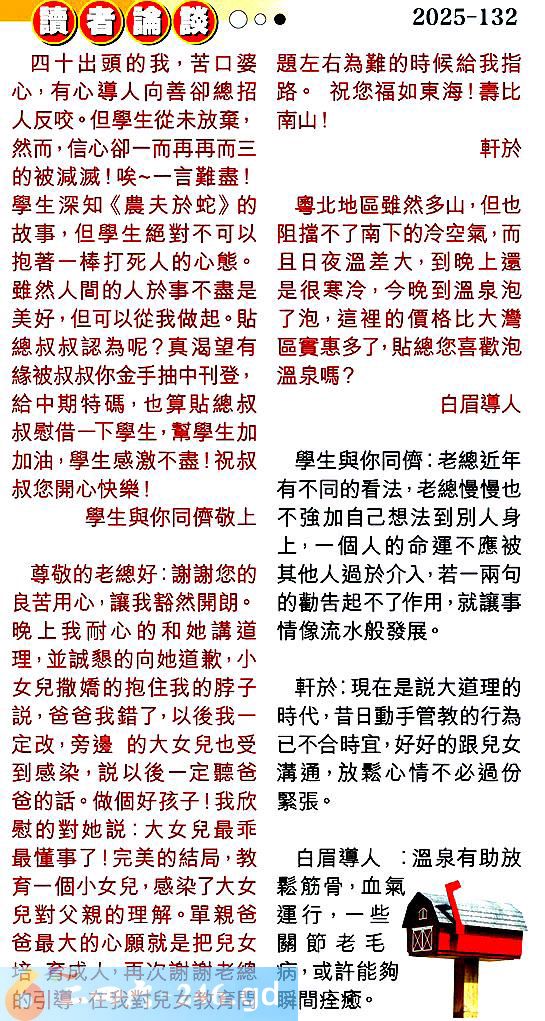 1.四十出頭的我,苦口婆心,有心導人向善卻總招人反咬。但學生從未放棄,然而,信心卻一而再再而三的被減滅!唉一言難盡!學生深知《農夫於蛇》的故事,但學生絕對不可以抱著一棒打死人的心態。雖然人間的人於事不盡是美好,但可以從我做起。貼總叔叔認為呢?真渴望有緣被叔叔你金手抽中刊登,給中期特碼,也算貼總叔叔慰借一下學生,幫學生加加油,學生感激不盡!祝叔叔您開心快樂!學生與你同儕敬上