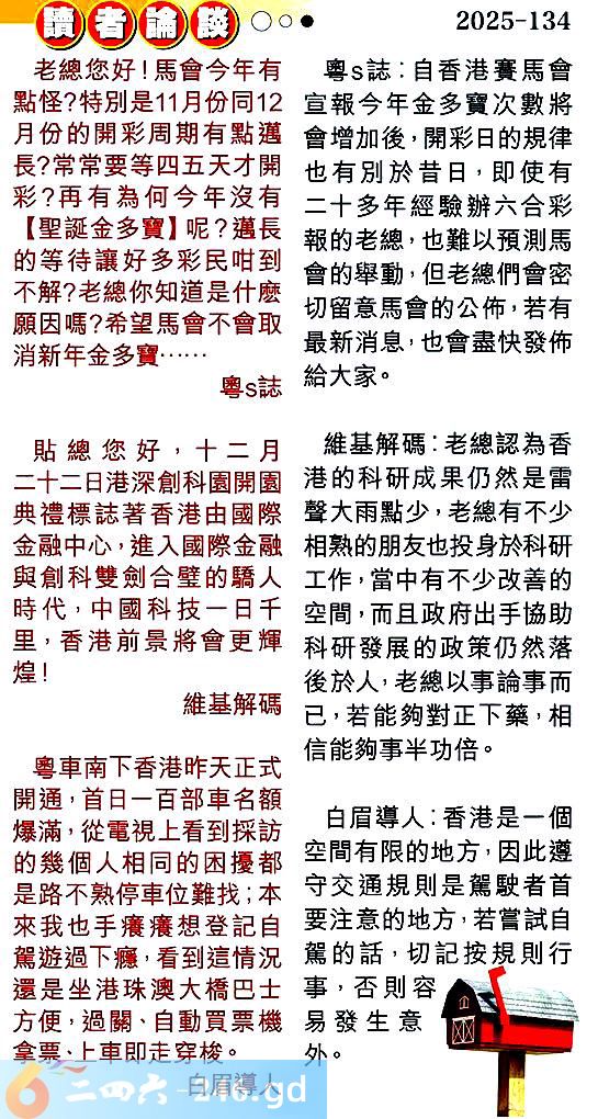 第一三四期讀者論談 1.老總您好!馬會今年有點怪?特別是11月份同12月份的開彩周期有點邁長?常常要等四五天才開彩?再有為何今年沒有【聖誕金多寶】呢?邁長的等待讓好多彩民咐到不解?老總你知道是什麼願因嗎?希望馬會不會取消新年金多寶......粵誌 〖粵誌〗:自香港賽馬會宣報今年金多寶次數將會增加後,開彩日的規律也有別於昔日,即使有二十多年經驗辦六合彩報的老總,也難以預測馬會的舉動,但老總們會密切留意馬會的公佈,若有最新消息,也會盡快發饰給大家。 〖維基解碼〗:老總認為香港的科研成果仍然是雷聲大雨點少,老總有不少相熟的朋友也投身於科研工作,當中有不少改善的空間,而且政府出手協助科研發展的政策仍然落後於人,老總以事論事而已,若能夠對正下藥,相信能夠事半功倍。 2.貼總您好,十二月二十二日港深創科園開園典禮標諾蓍香港由國際金融中心,進入國際金融與創科雙劍合璧的驕人時代,中國科技一日千里,香港前景將會更輝煌!維基解碼 3.粤車南下香港昨天正式開通,首日一百部車名額爆滿,從電視上看到探訪的幾個人相同的困擾都是路不熟停車位難找;本來我也手癢癢想登記自駕遊過下癮,看到這情況還是坐港珠澳大橋巴士方便,過關,自動買票機拿票上車即走穿梭。白眉導人 〖白眉導人〗:香港是一個空間有限的地方,因此遵守交通規則是駕駛者首要注意的地方,若嘗試自駕的話,切記按規則行事,否則容易發生意外。