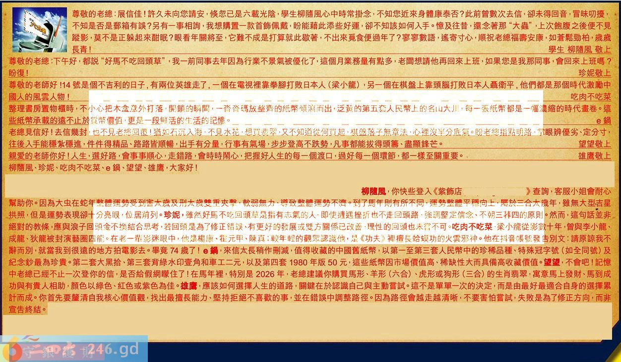 【1】.尊敬的老總:展信佳!許久未向您請安,倏忽已是六载光陰,學生柳隨風心中時常掛念,不知您近來身體康泰否?此前曾數次去信,卻未得回音,冒昧叨擾不知是否是郵箱有誤?另有一事相詢,我想購置一款首飾佩戴,盼能藉此添些好運,卻不知該如何入手。憶及往昔,還念著那“大蟲”,上次飽腹之後便不見蹤影,莫不是正躲起來酣眠?眼看年關將至,它難不成是打算就此歇著,不出來觅食便過年了?寥寥數語,遙寄寸心,順祝老總福壽安康,如蒼鬆勁柏,歲歲長青!學生柳隨風敬上