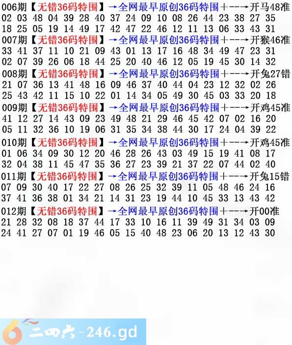 六合彩012期:无错36码