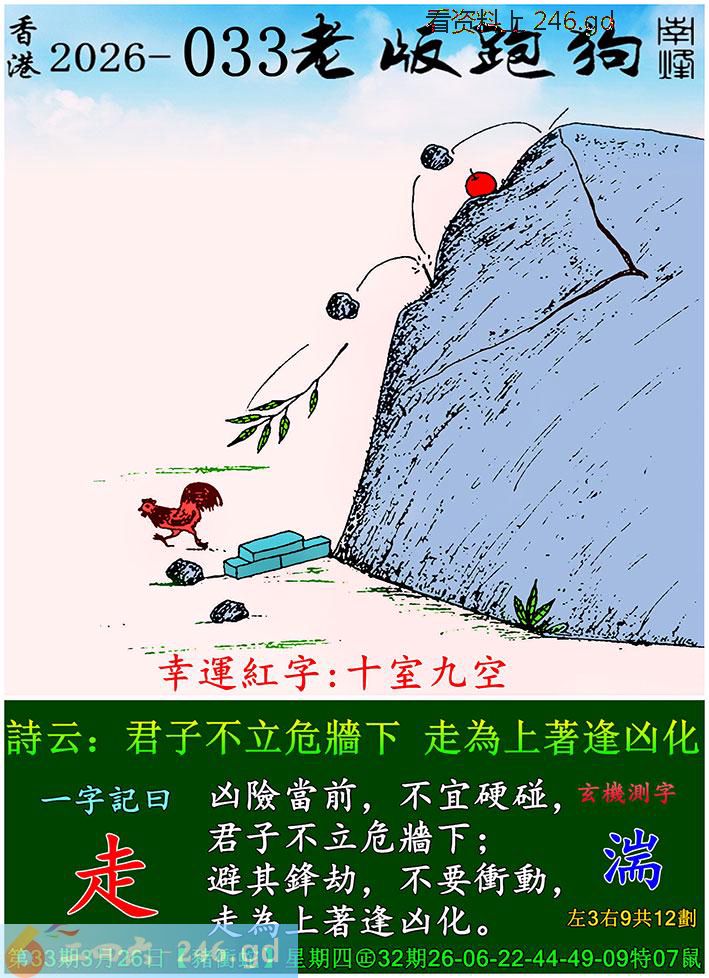 033期老版跑狗一字記之曰:【走】 詩雲:君子不立危牆下,走為上著逢凶化。 凶險當前,不宜硬碰,君子不立危牆下; 避其鋒劫,不要衝動,走為上著逢凶化。 玄機測字:《湍》