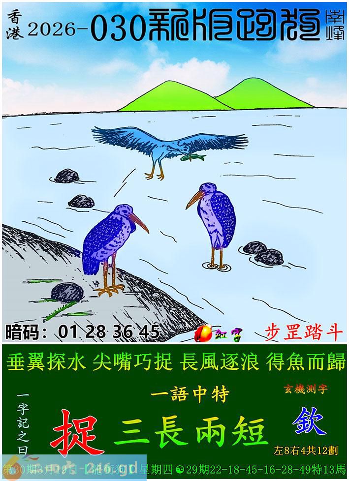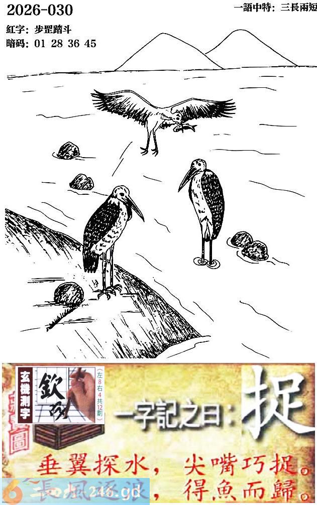 030期跑狗一字記之曰:【捉】 垂翼探水,尖嘴巧捉。 長風逐浪,得魚而歸。 玄機測字:《欽》 一語中特:三長兩短