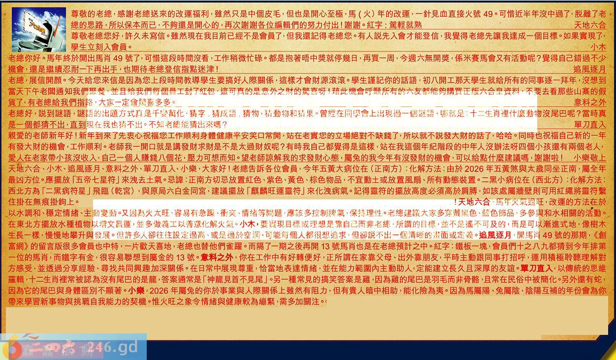 【4】.老總,展信開顔。今天給您來信是因為您上段時間教導學生要搞好人際關係,這樣才會財源滾滾。學生謹記你的話語,初八開工那天學生就給所有的同事逐一拜年,沒想到當天下午老關通知我們聚餐,並且給我們每個員工封了紅包,這可真的是意外之財的驚喜呀!藉此機會呼籲所有的六友都能夠購買正版六合皇資料,不要去看那些山寨的假货了,有老總給我們指路,大家一定會驚喜多多。意料之外