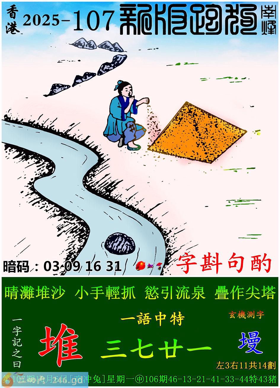 107期新版跑狗一字記之曰:【堆】 晴灘堆沙,小手輕抓。 慾引流泉,疊作尖塔。 玄機測字:【墁】 一語中特:三七甘一