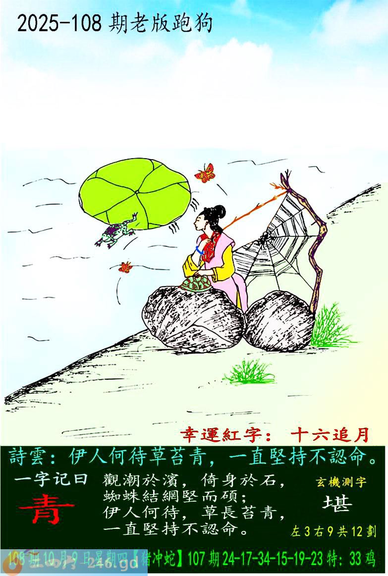 108期老版跑狗一字記之曰:【青】 詩雲:伊人何待草苔青,一直堅持不認命。 觀潮於濱,倚身於石,蜘蛛結網堅而碩; 伊人何待,草長苔青,一直堅持不認命。 玄機測字:《堪》