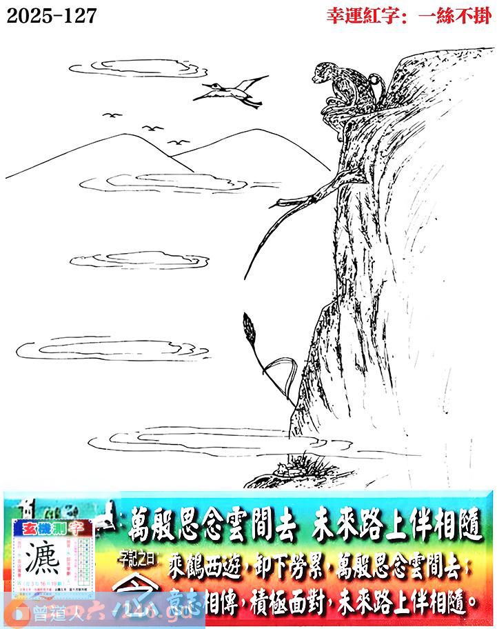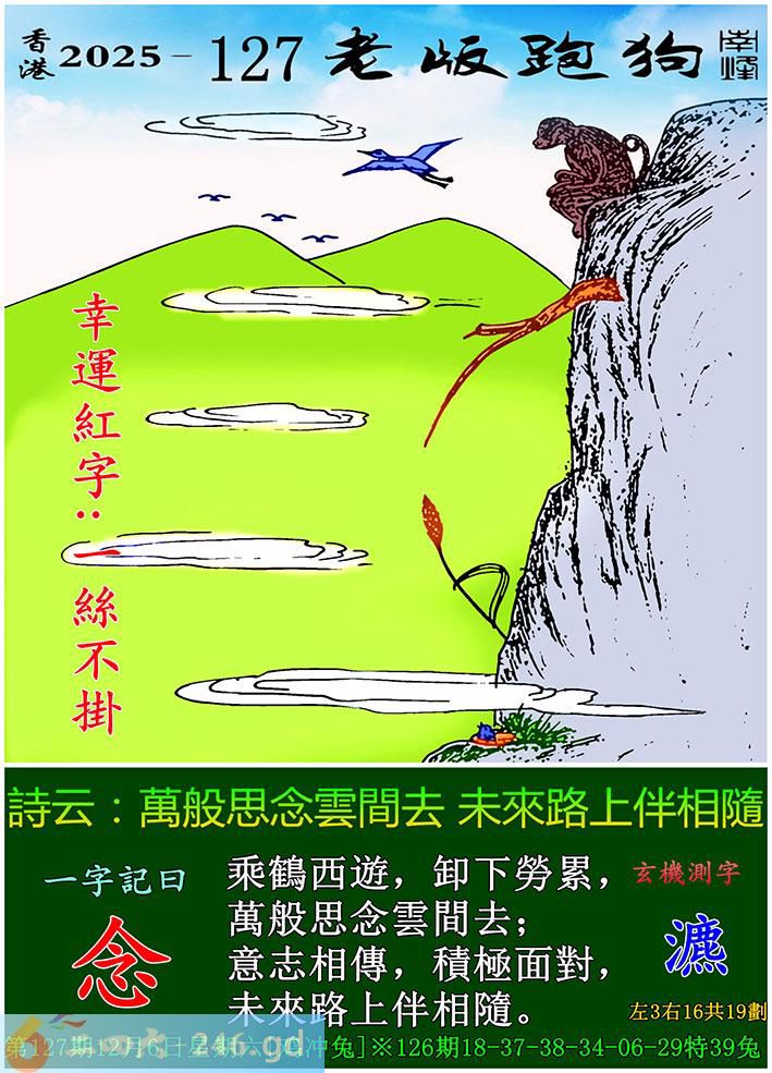 127期老版跑狗一字記之曰:【念】 詩雲:萬般思念雲間去,未來路上伴相隨。 乘鶴西遊,卸下勞累,萬般思念雲間去; 意志相傳,積極面對,未來路上伴相隨。 玄機測字:《瀌》