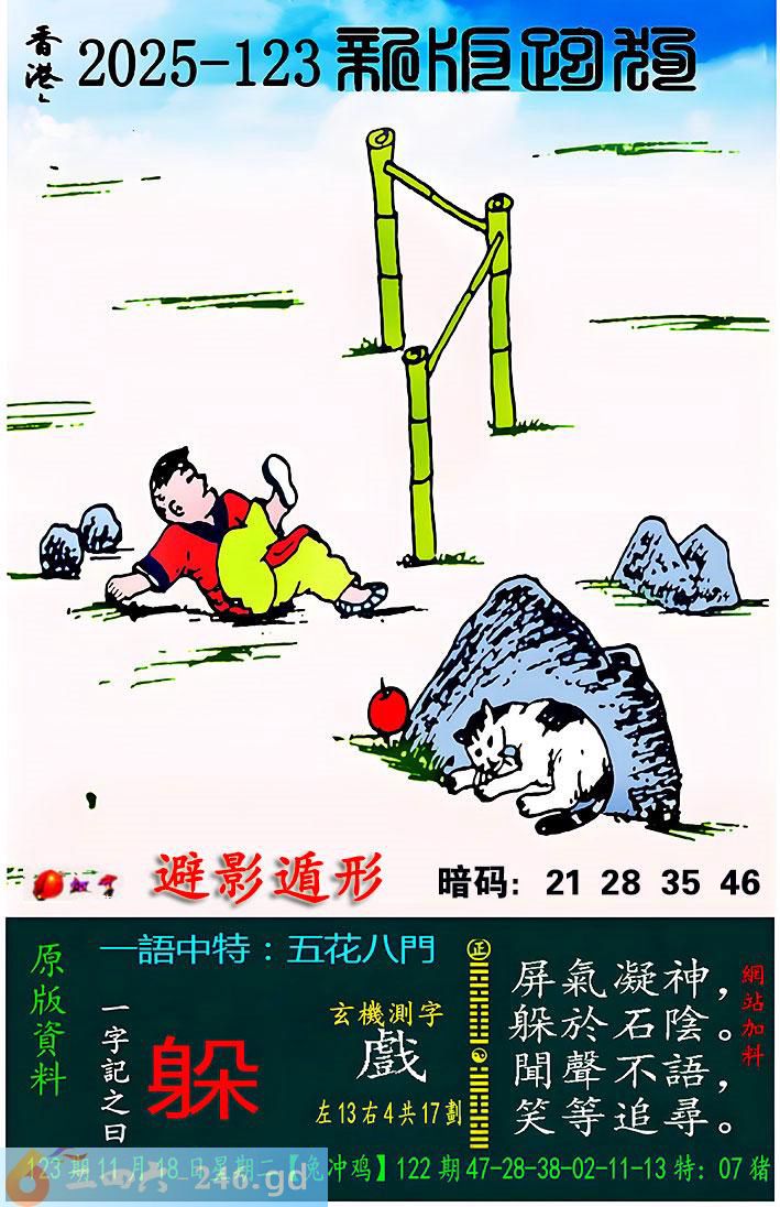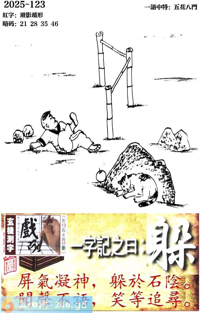 123期跑狗一字記之曰:【躲】 屏氣凝神,躲於石陰。 聞聲不語,笑等追尋。 玄機測字:《戲》 一語中特:五花八門