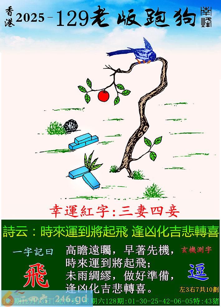 六合彩129期老版跑狗一字記之曰:【飛】 詩雲:時來運到將起飛,逢凶化吉悲轉喜。