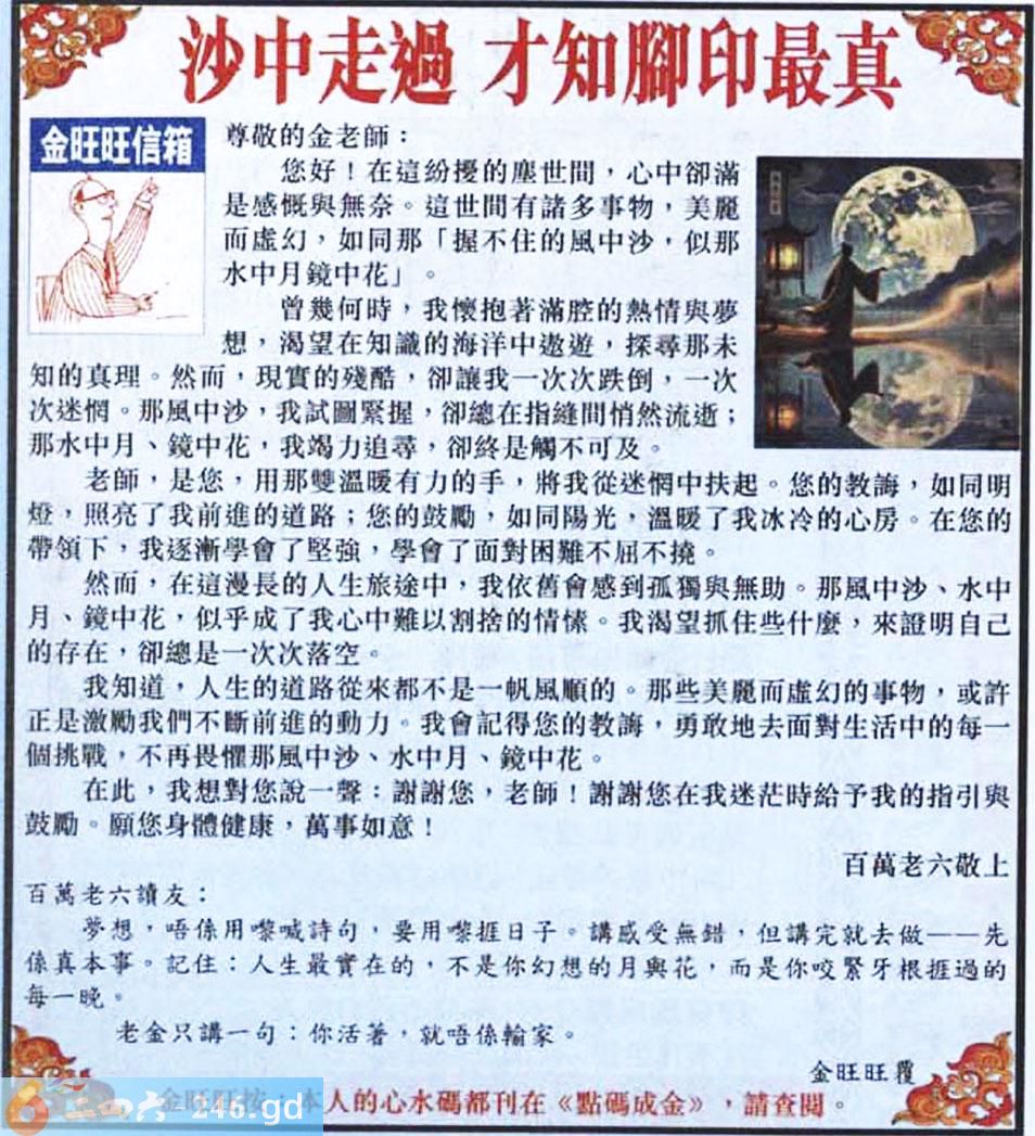 六合彩001期:金旺旺信箱彩民推荐→→《沙中走過 才知腳印最真》