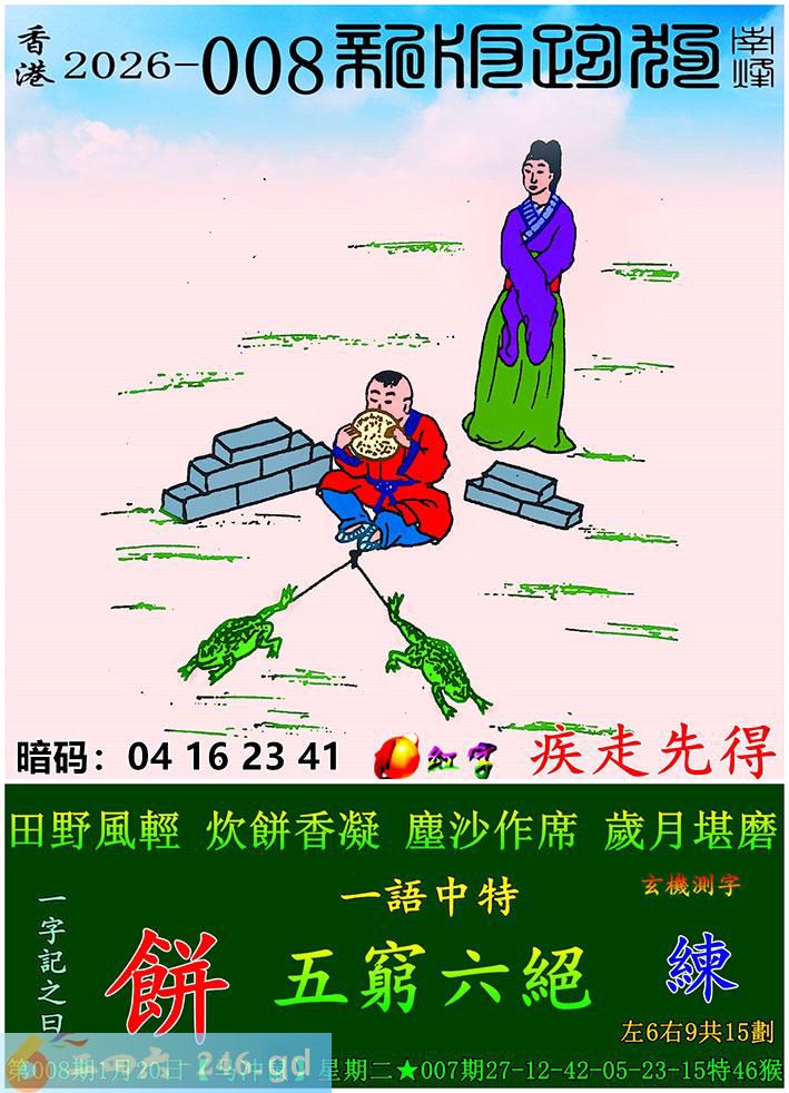 008期跑狗一字記之曰:【餅】 田野風輕,炊餅香凝。 塵沙作席,歲月堪磨。 玄機測字:《練》 一語中特:五窮六絕
