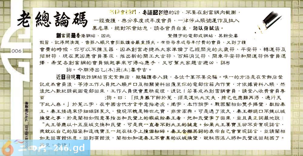 六合彩006期:六合皇金句/老总论码/萧公子/林大师/五行夺码/老总信箱截图